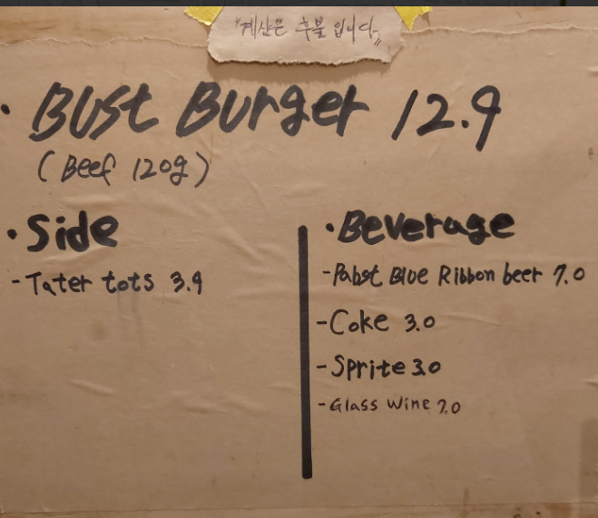 메뉴는 "BUST BURGER" (토싯살 스테이크 버거) 단일 메뉴예요!!
