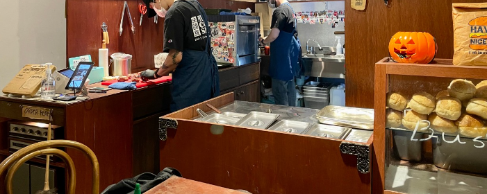 빵을 오븐에 구워주시고 고기도 직접 썰고 계신답니다.