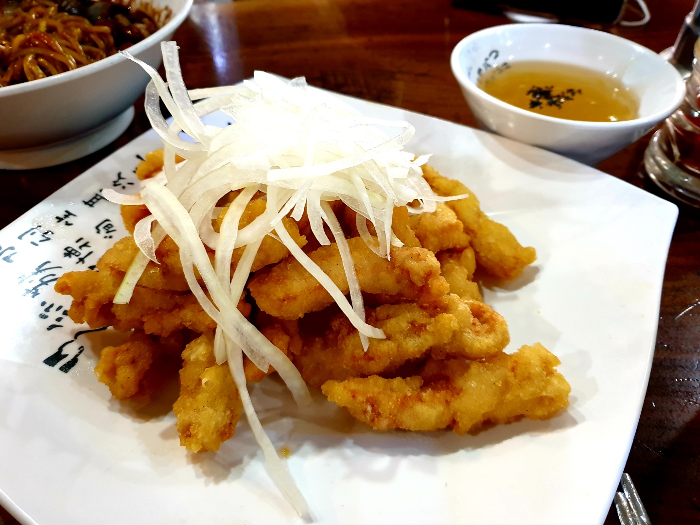 탕수육에는 이렇게 양파를 올려서 줍니다. 소스에는 다른 탕수육 집과 달리 야채? 같은 게