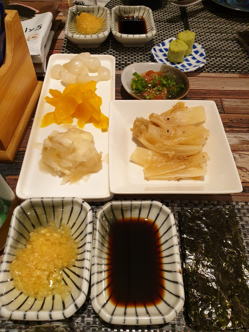 처음 세팅은 마늘과 올리브유 등을 섞은 시그니처 소스와 간장, 김, 백김치, 참치 내장젓갈 등이 나옵니다.