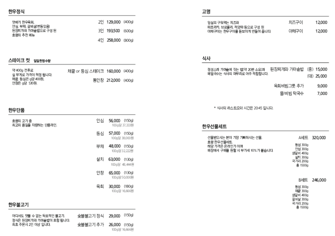 메뉴는 한우 정식 2~4인이 있고, 한우 단품(안심, 등심, 부채, 살치, 안창, 육회),